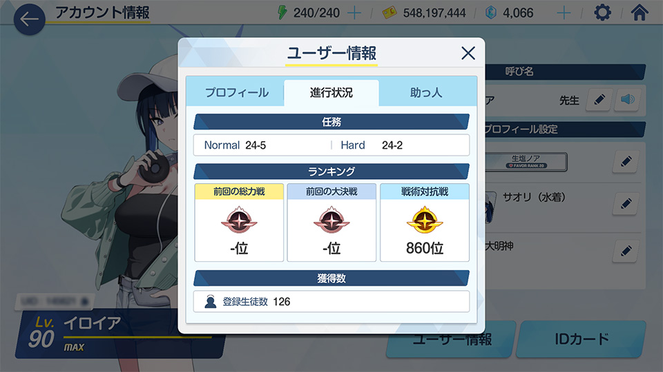 メインストーリーアビドス編3章(最新)、イベントシナリオは半々。ステージN24-5 H24-2まで進行。
